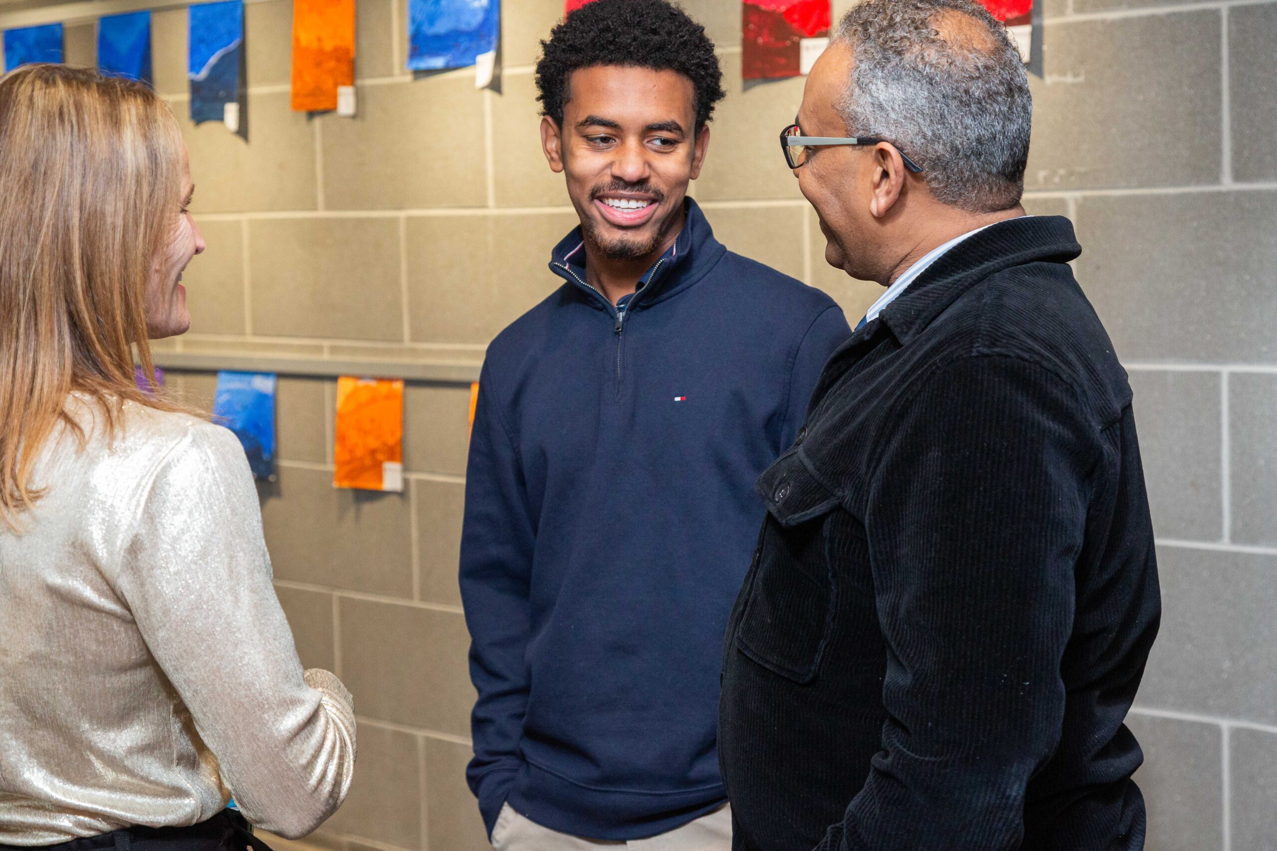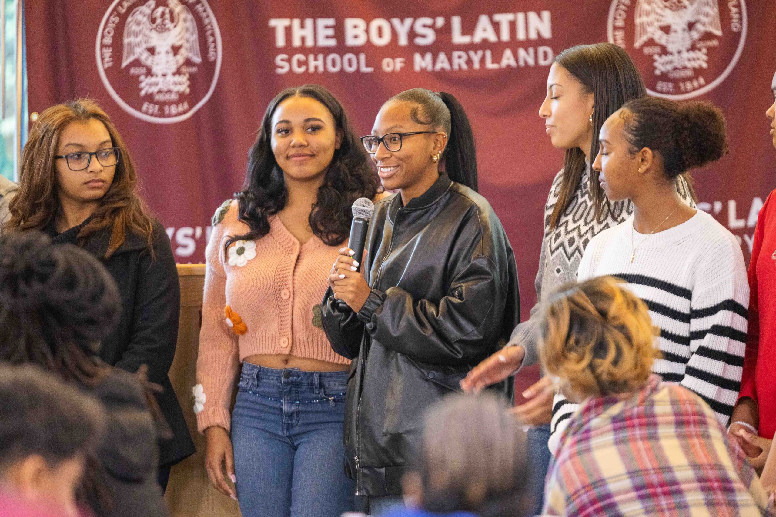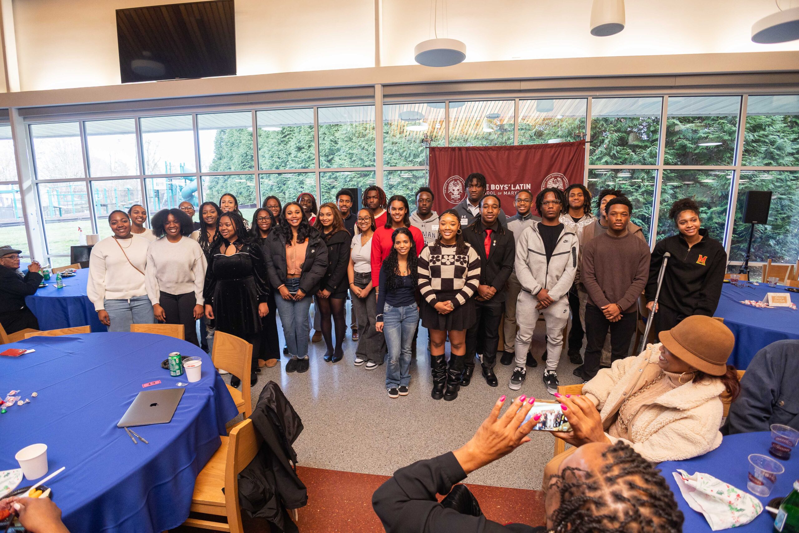 Last weekend more than 300 B.E.S.T. family members and students gathered at The Boys’ Latin School of Maryland to kick off the holiday season together. The event began with a special gathering for Senior families, where the Class of 2026 was recognized as soon-to-be Alumni. Families heard a heartfelt letter from B.E.S.T. Deputy Director and B.E.S.T./Garrison Forest Alumna Crystal Lee ’96, who encouraged students to pay it forward and support younger B.E.S.T. students as they grow. Seniors took part in a “give back” ceremony, offering their first symbolic gift to B.E.S.T. to Jess Suriano, Executive Director, and receiving a B.E.S.T. Alumni lapel pin from Peggy Bittner, Director of Programs and Alumni Relations, to mark the moment.